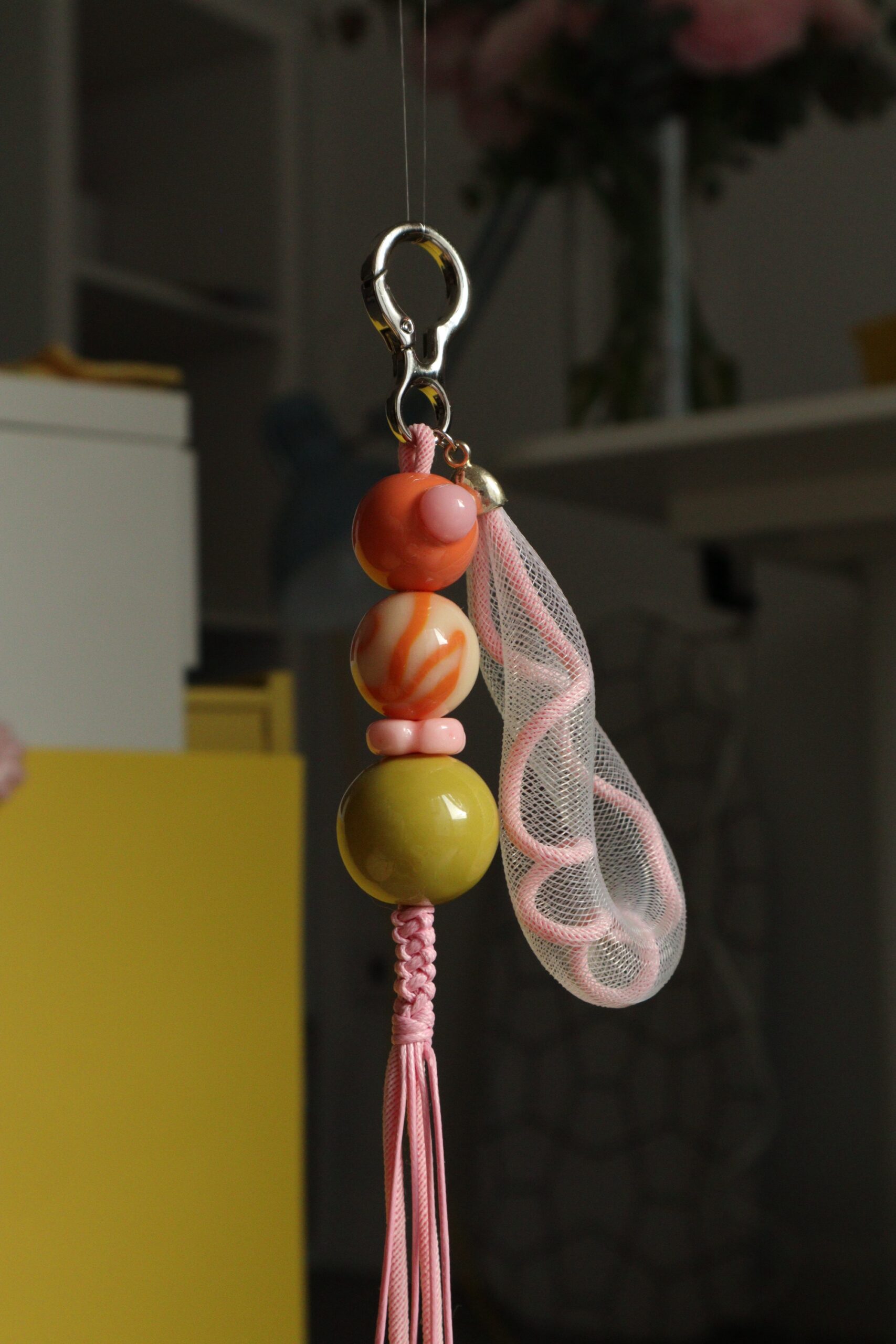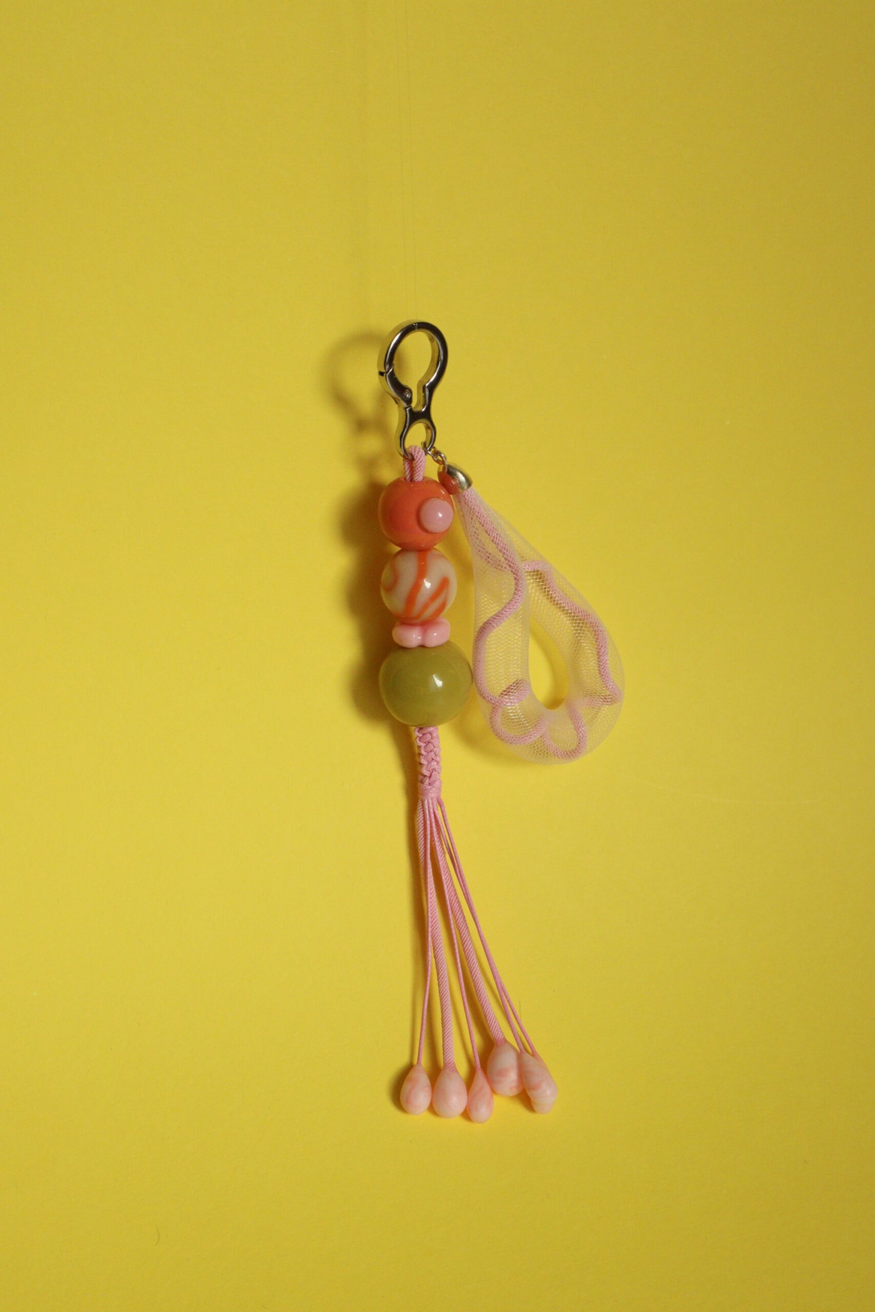 Полимерная глина, кринолиновая трубка, уф-гель. Длина 12 см., диаметр карабина 1,5 см.