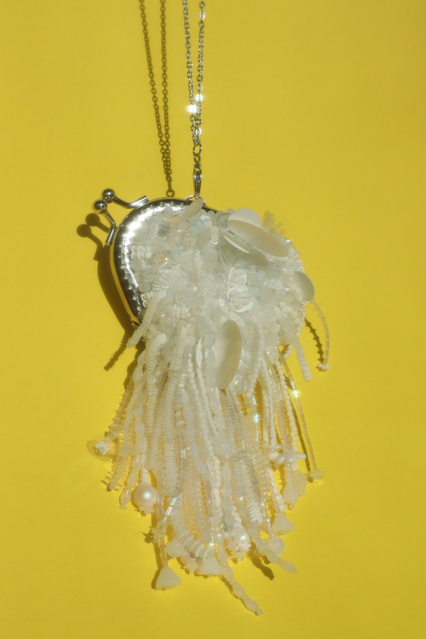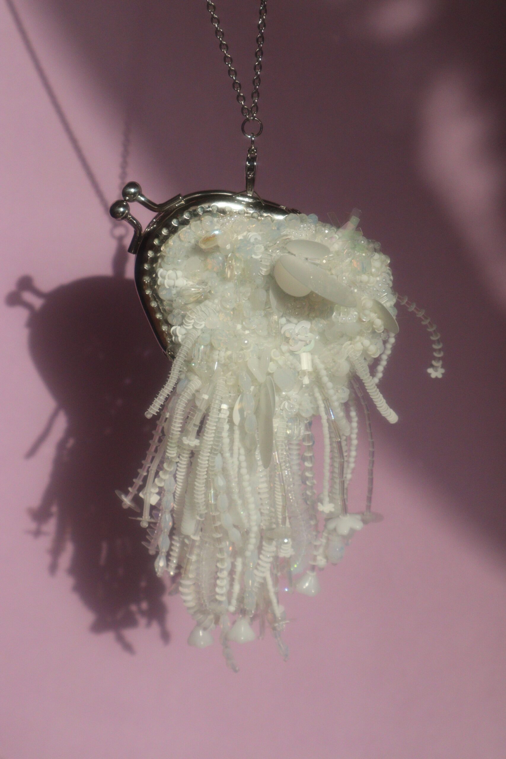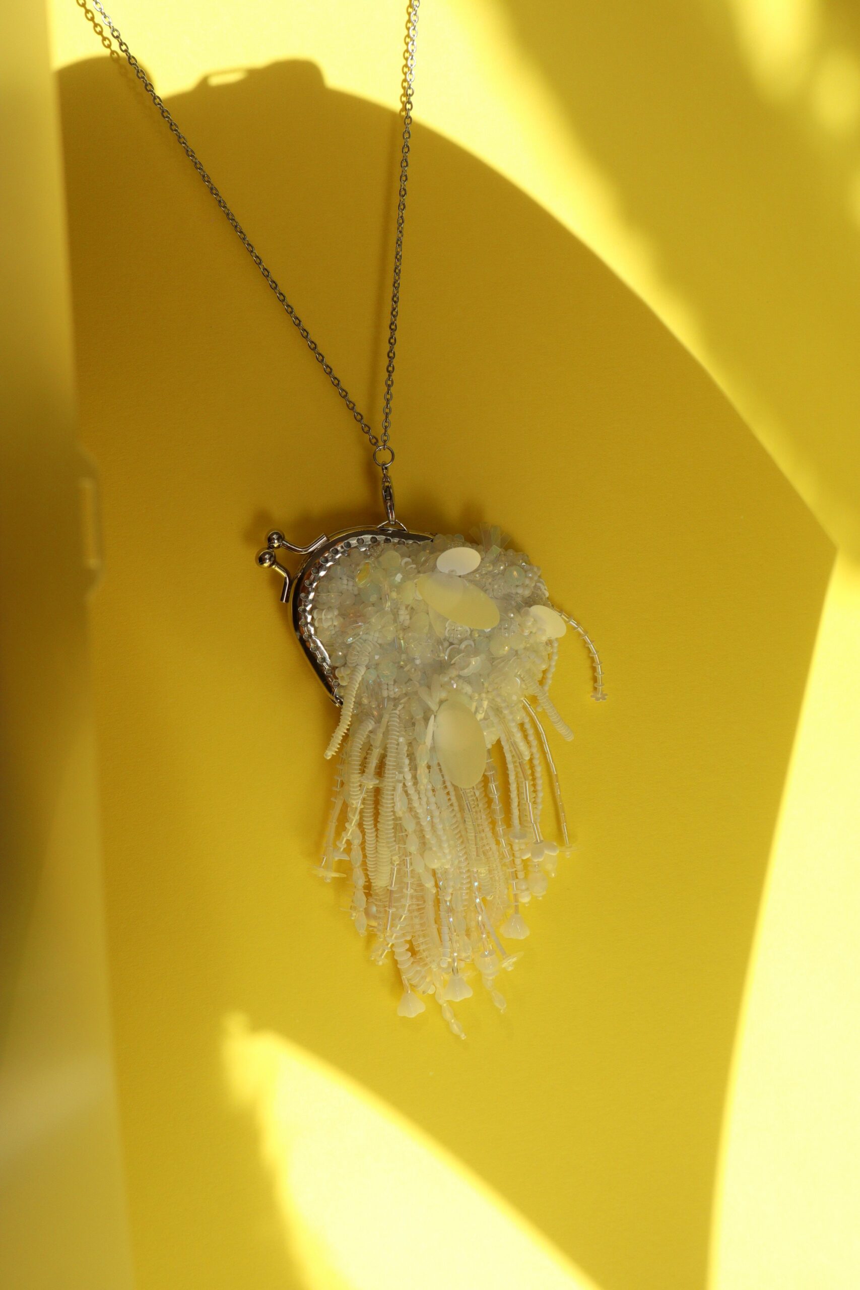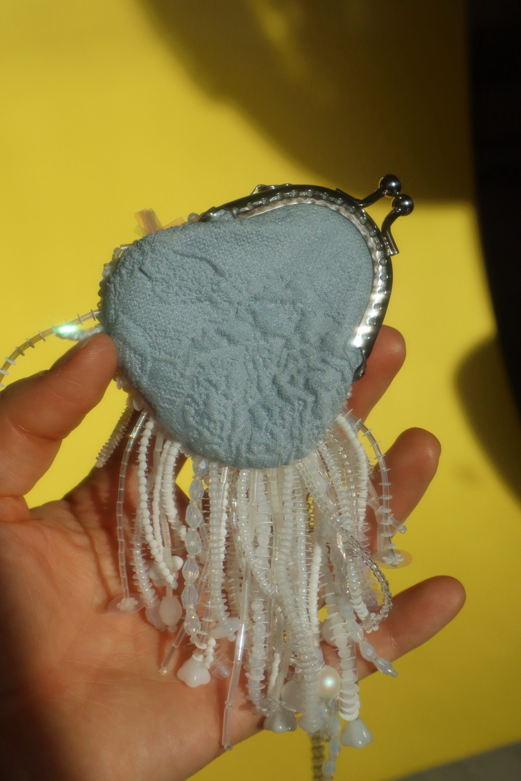 Размеры сумочки микроскопические: 8*7 см. Длина бахромы 8.5 см. В комплекте будет цепочка 60 см, чтобы крошку можно было повесить на шею как кулончик. По запросу могу положить цепочку подлиннее, чтобы крошку можно было повесить на плечо или через плечо. Обратная сторона из шелкового жаккарда голубого цвета