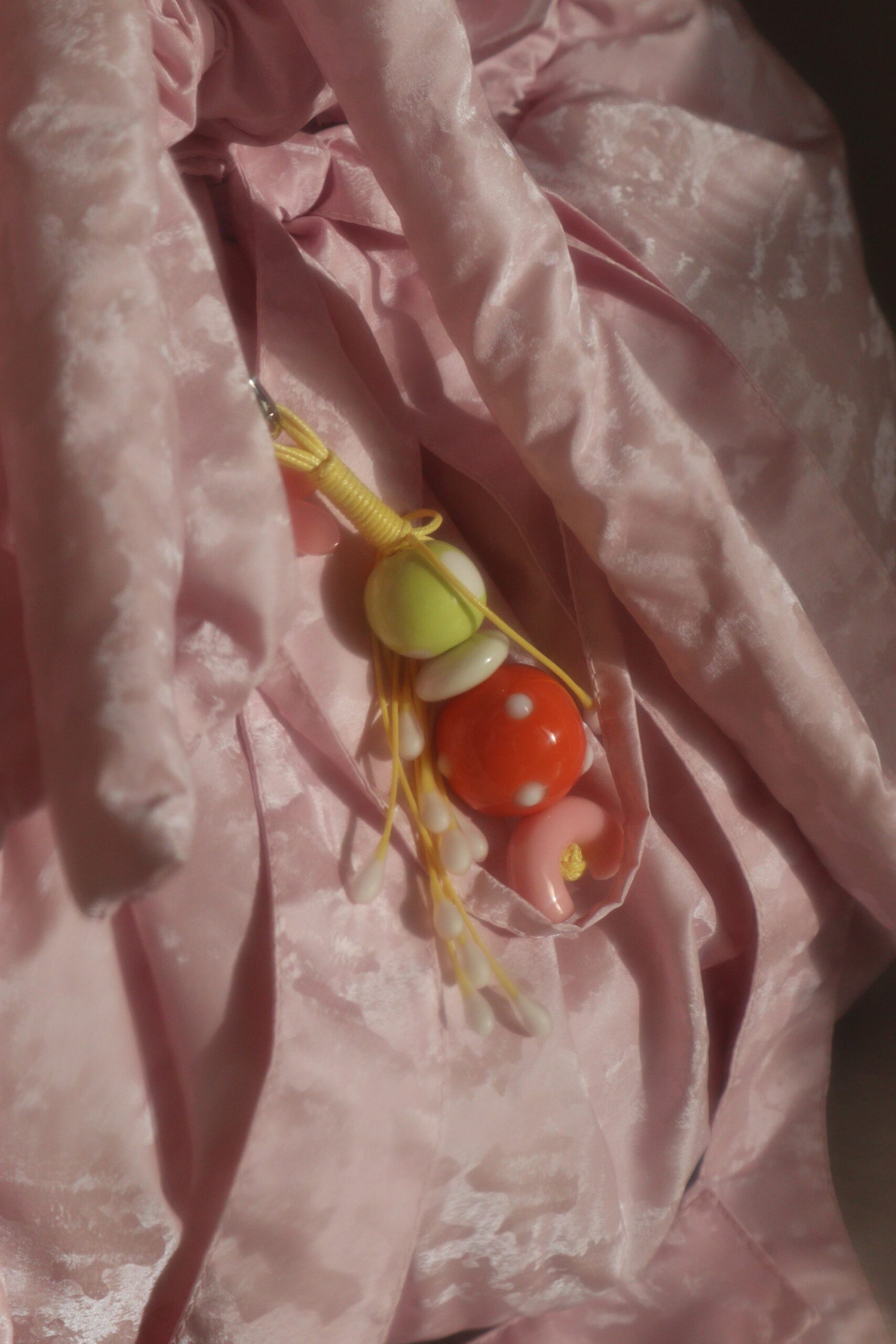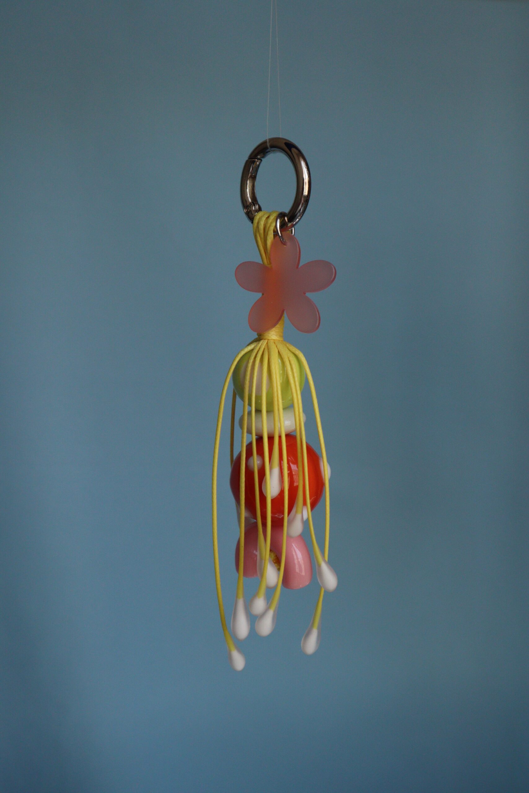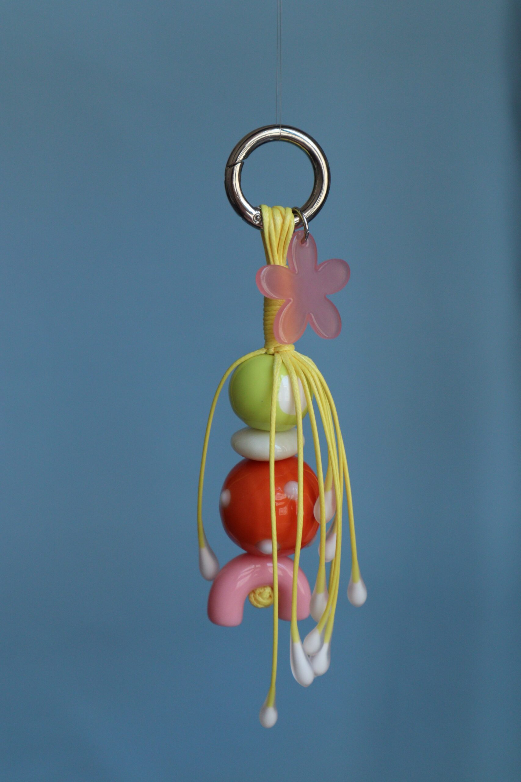 Брелок/подвес на сумку и тп. Полимерная глина, шнуры, стеклянные бусины, цветочек из акрила. Длина 15.5 см., диаметр карабина 2 см.